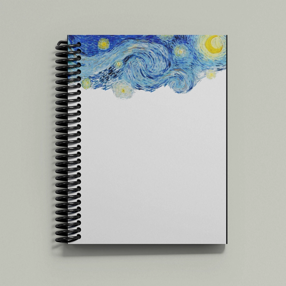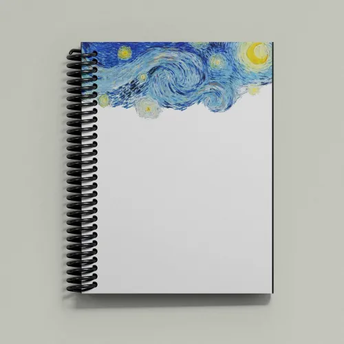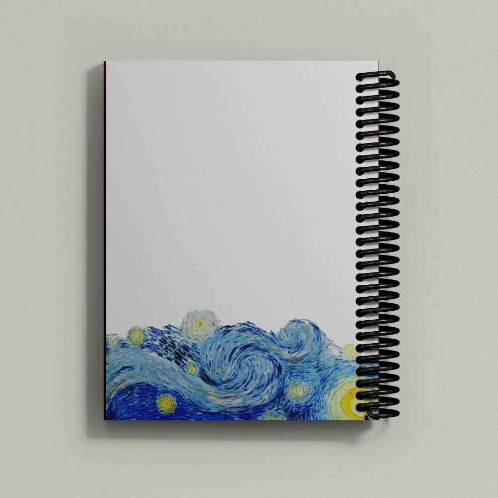 مستوحى من “ليلة النجوم” لفان جوخ. غلاف أيقوني يحفّز الخيال ويحوّل الدفتر لمساحة آمنة لقصائدك ورسوماتك وأفكارك الحالمة.